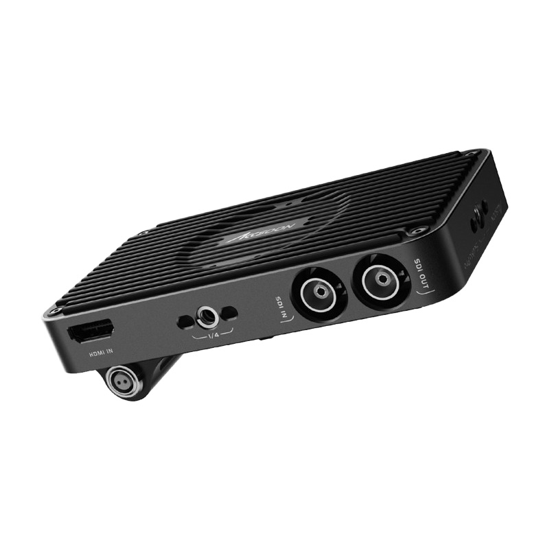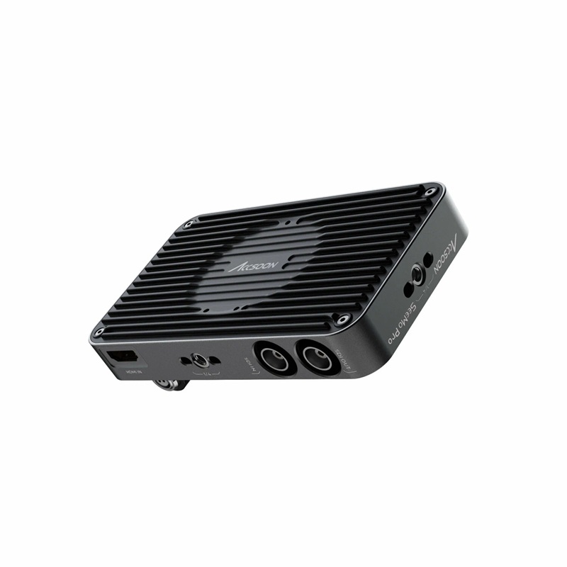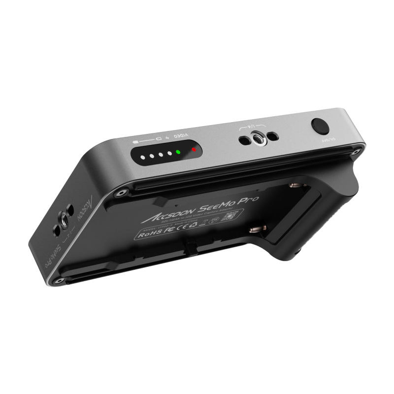 Accsoon SeeMo Pro is an iOS HDMI/SDI video capture adapter up to 1080p60 with device charging, SDI loop output, NP-F or 2-pin DC power (6.4–16.8 V), and four 1/4″-20 mounts; requires Accsoon See app.