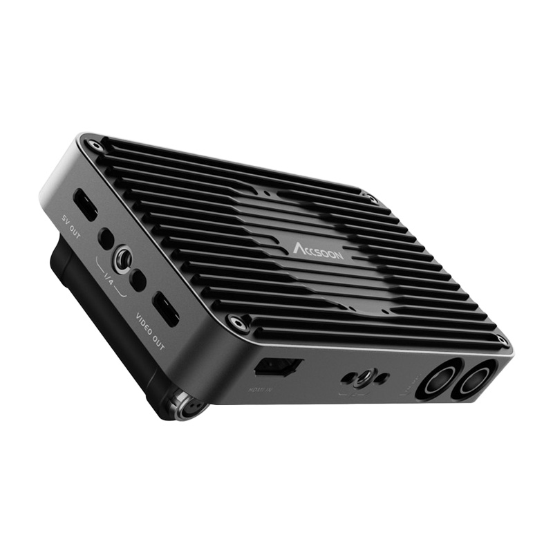 Accsoon SeeMo Pro video capture adapter for iOS transmits video up to 1080p/60 from a camera or PC via HDMI or SDI output to an iPhone or iPad. The iOS device can then act as a monitor, a live streaming publishing device, and a recorder. Accsoon SeeMo Pro provides wired video transmission and charges the mobile device; each function has its own dedicated USB Type-C port. An additional SDI output is useful when a second monitor needs to be connected. Power is possible from a Sony NP-F type battery or via a 2-pin DC input (6.4–16.8 V). The body includes four 1/4″ threaded mounting holes for attaching to a cage or other rig component.