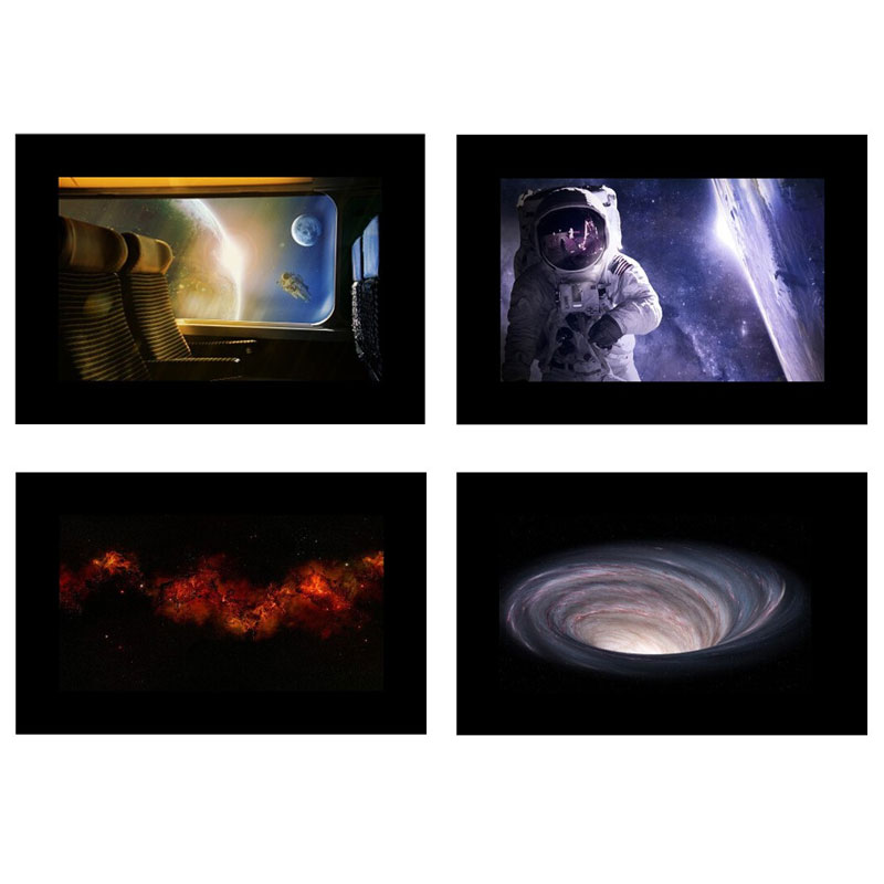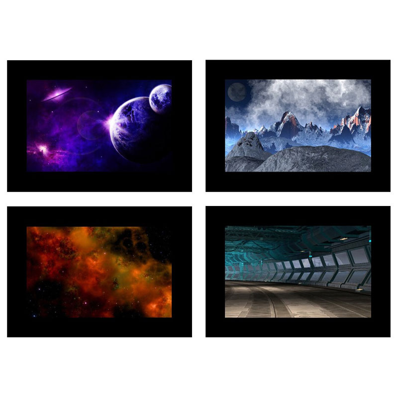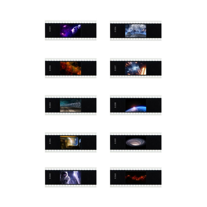 AK-S06 slide set includes 10 slides for the Godox AK-R21 projection attachment. Slides are inserted into the dedicated frame supplied with the attachment. The images feature dark-toned designs with space and industrial themes.