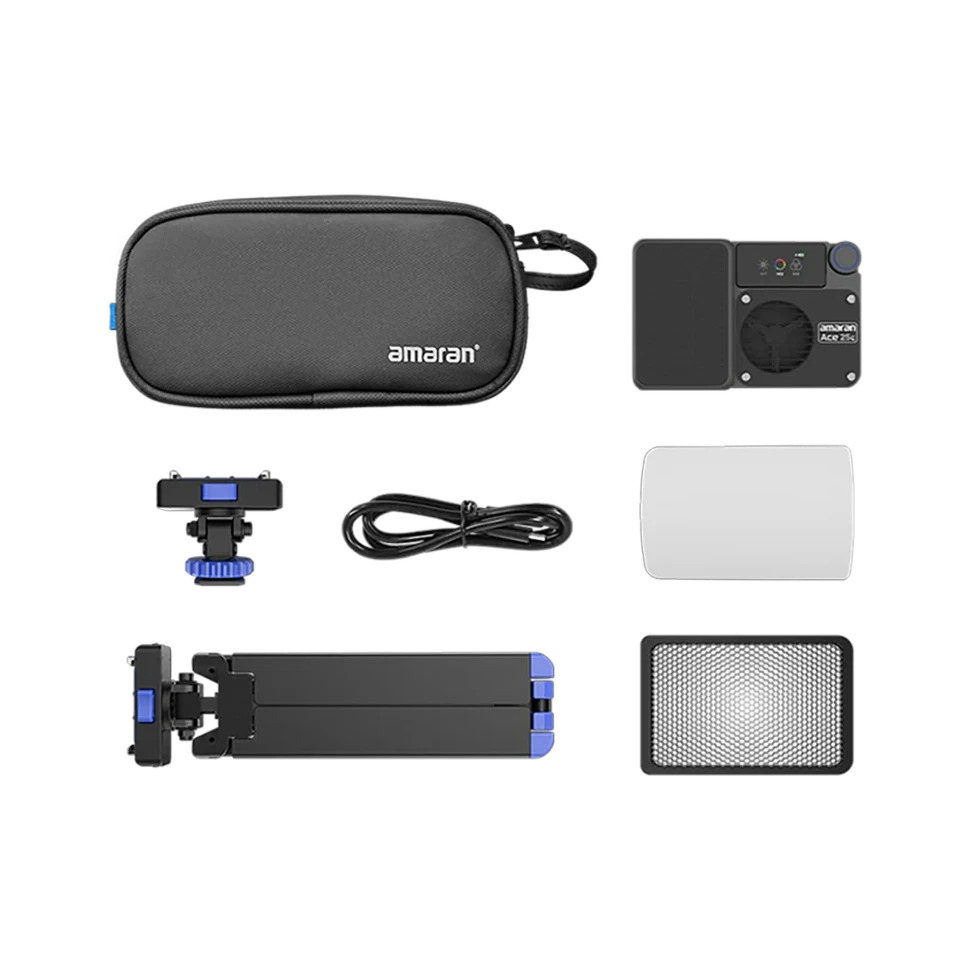 Special kit with an Aputure Amaran Ace 25c light, compact tripod, case, hot-shoe mount, and two accessories for your tasks.