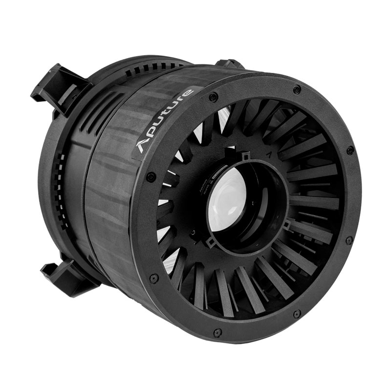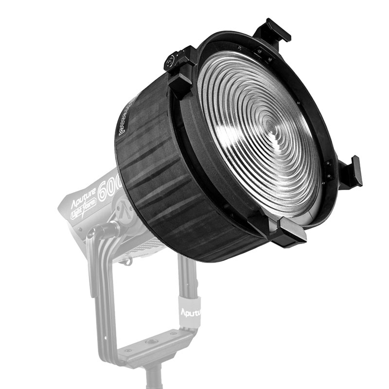 Aputure Fresnel F10 lens with a 250 mm diameter features a Bowens mount and is designed for use with the LS 600d Pro, increasing maximum brightness by up to 340%. The lens uses dual optical elements, one with an aspherical surface. Beam angle is adjustable from 15° to 45°, producing up to 224,200 lux at 1 m at 15° and 89,200 lux at 1 m at 45°. The front accessory diameter is 333 mm (13.1″). Dimensions are 346×341×173 mm at 45° and 346×341×250 mm at 15°. Total weight with bag is 5.65 kg. Included: Aputure Fresnel F10 lens, transport bag.
