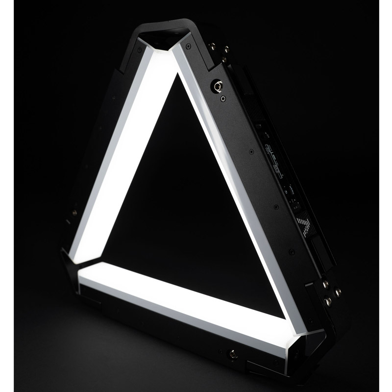 Triangle 3D connector set for Aputure INFINIBAR panels allows building a three-dimensional light triangle or other shapes from multiple fixtures. The connector positions panels at a 60° angle to each other, with the emitting sides facing inward. The rental set includes three connectors with eye bolts.