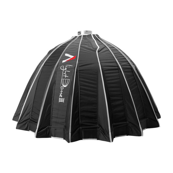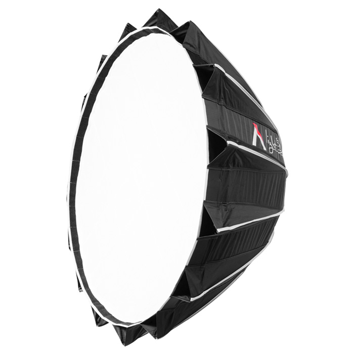 Aputure Light Dome III (90 cm diameter) is designed to soften light when working with powerful Bowens-mount LED fixtures. The model features a quick-fold design and a collapsible base-ring mechanism. Sixteen ribs are connected to the base, and assembly requires moving the ring into the working position. For transport, the softbox fits into a flat case measuring 88 × 18 × 5 cm.
