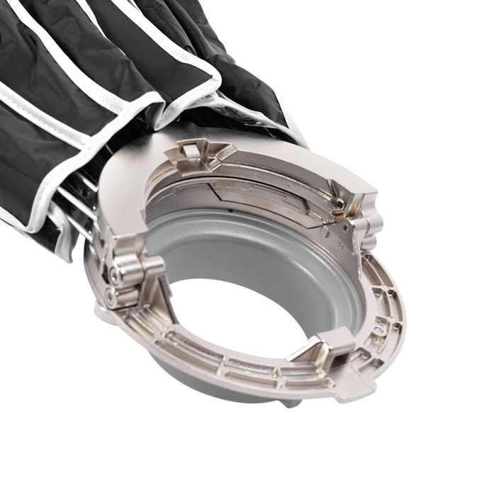 With a Bowens mount, the softbox is compatible with many fixtures. Overall depth is 650 mm. Two outer diffusers with different transmission (1 stop and 2 stop) can be selected. The included grid is designed to reduce the beam spread by 40° and provide even softer shadows.