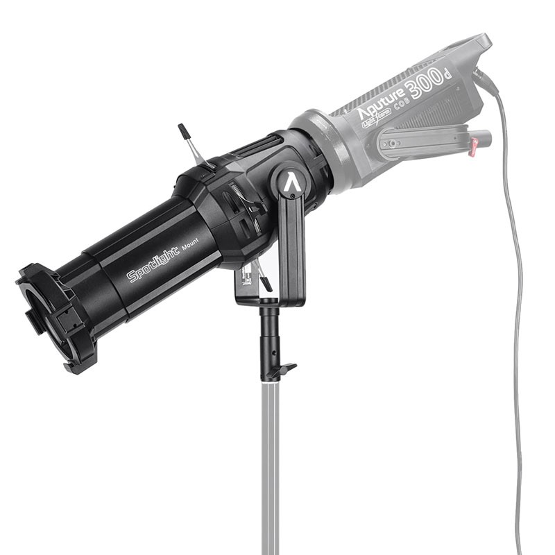 Aputure Spotlight 36 uses a Bowens mount and complements Aputure Light Storm COB fixtures, increasing brightness: