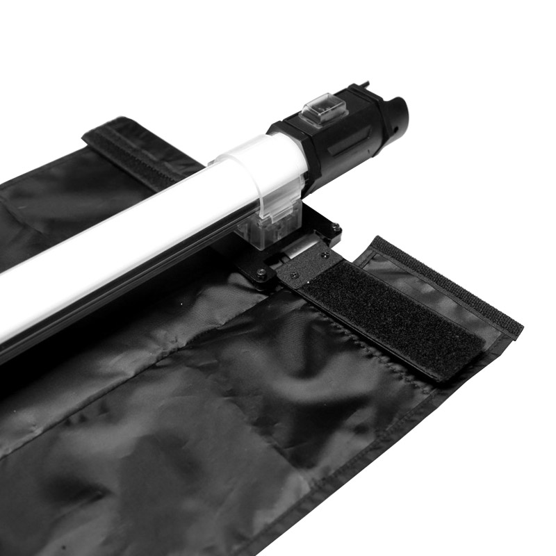 The rental kit includes adjustable barndoors and a 45° square honeycomb grid compatible with the NanLite PavoTube 15C LED tube. These accessories are used to redirect and narrow the beam and to soften the light. The adjustable barndoor design allows limiting the beam angle from 180° down to 5°. Installed accessories do not block access to the controls.