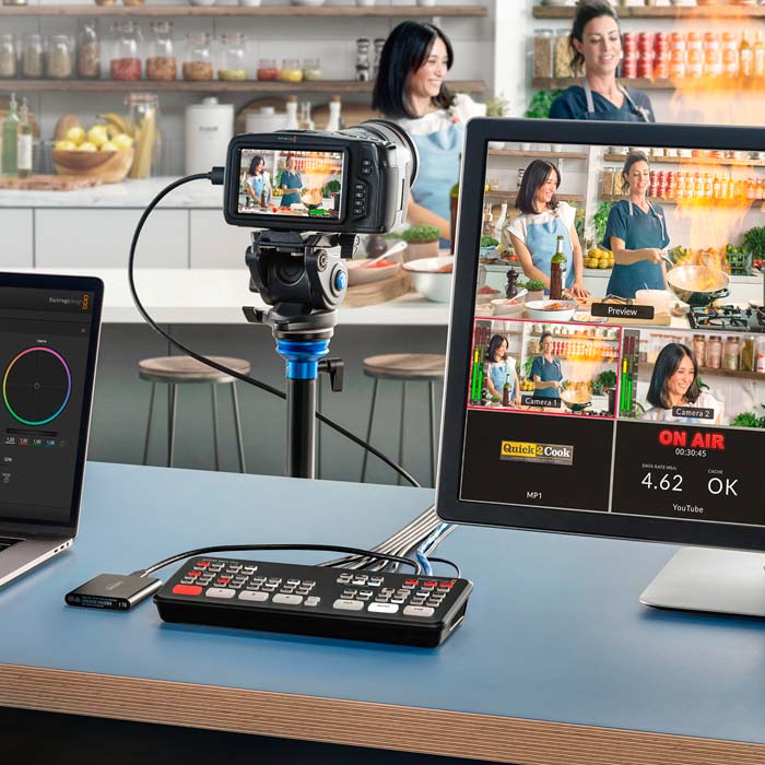 Included: Blackmagic ATEM Mini Pro switcher, AC power adapter, carry case.