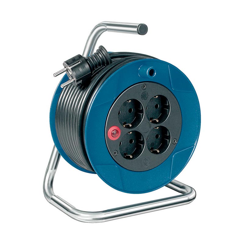 Brennenstuhl Garant 15 m reel (4 outlets) is a portable extension reel with four grounded, child-protected outlets and a 180 mm drum. It uses a galvanized steel frame and a handle for winding.