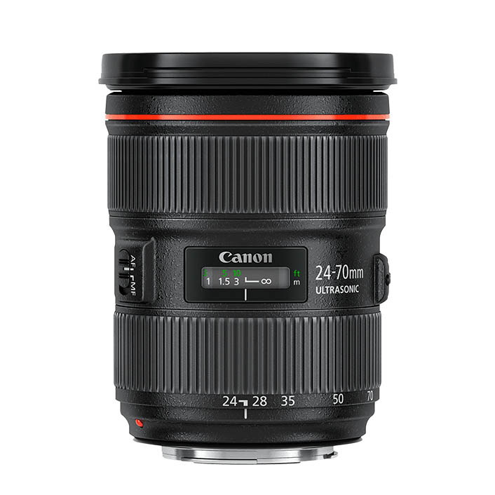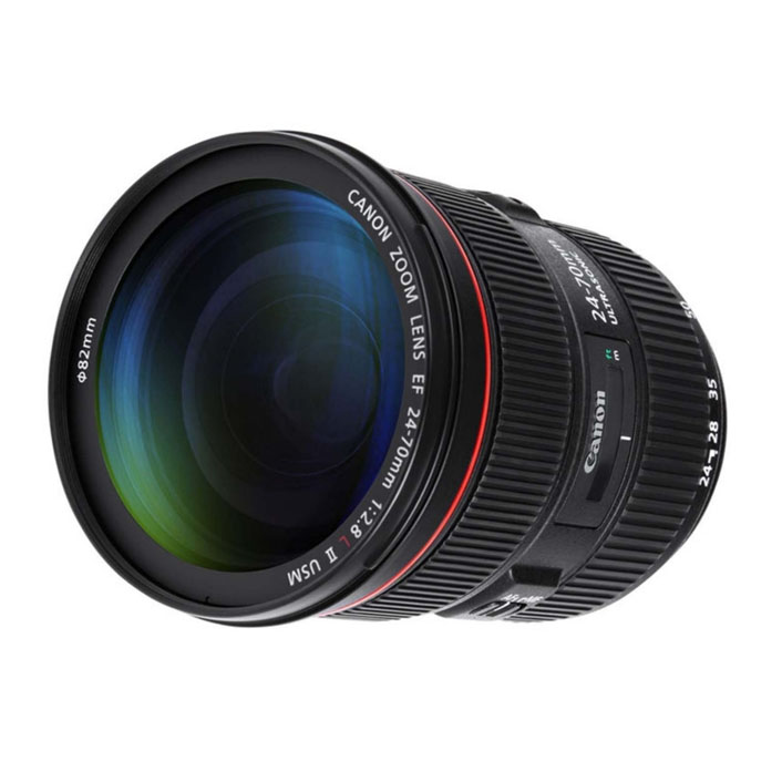 Canon EF 24–70mm f/2.8L II USM is a professional standard zoom with constant f/2.8 aperture for events and demanding shooting. The optical design includes 18 elements in 13 groups with aspherical, UD, and Super UD elements for exceptional sharpness across the frame. Fluorine coatings on front and rear elements repel dirt and moisture. A 9-blade circular diaphragm delivers smooth bokeh. Minimum focusing distance is 38 cm with 0.21× magnification. Updated ring-type USM provides fast, silent autofocus with full-time manual override. Included: Canon EF 24–70mm f/2.8L II USM lens, front and rear caps, UV filter, hood, pouch.