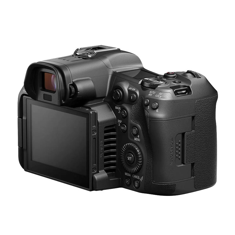Two card slots (CFexpress Type B and UHS-II SD) allow simultaneous recording in different formats, resolutions, and bit depths to separate cards for various professional workflows. Canon EOS R5 C features an OLED EVF, a swivel LCD screen, and 13 assignable buttons. The active cooling fan supports long recording sessions.