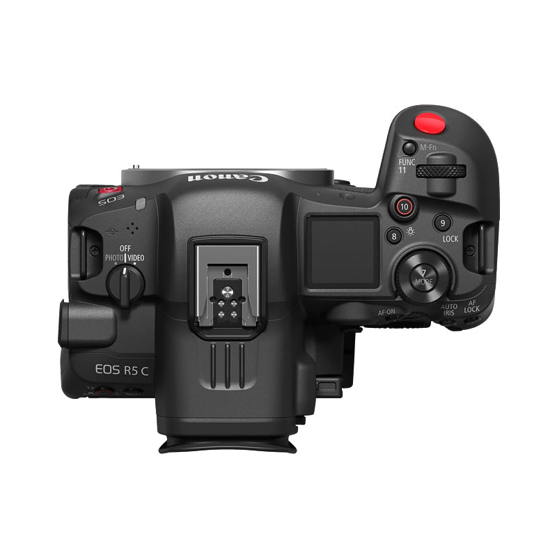 Canon EOS R5 C is a hybrid camera with active cooling for extended 8K recording and internal Cinema RAW Light formats. It uses dual card slots (CFexpress Type B + UHS-II SD) and supports pro monitoring/recording options via HDMI.
