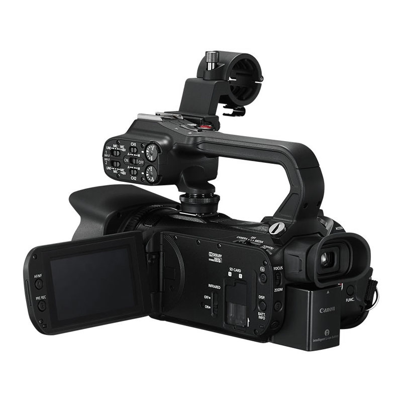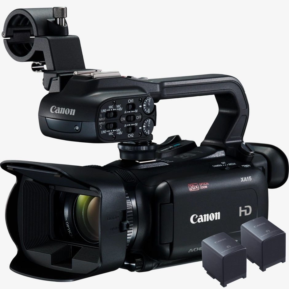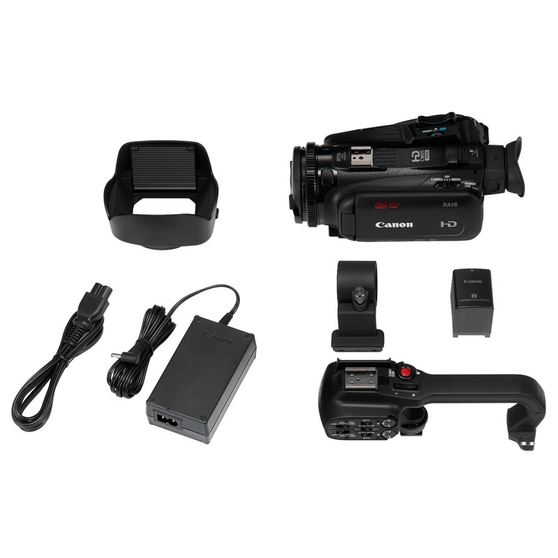 Included: Canon XA15 camcorder, lens hood, Canon AC adapter, batteries ×2, 32GB SD memory cards ×2, top handle with XLR inputs, mini HDMI to HDMI cable, RCA cable (on request), bag.