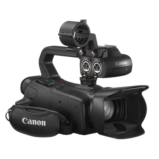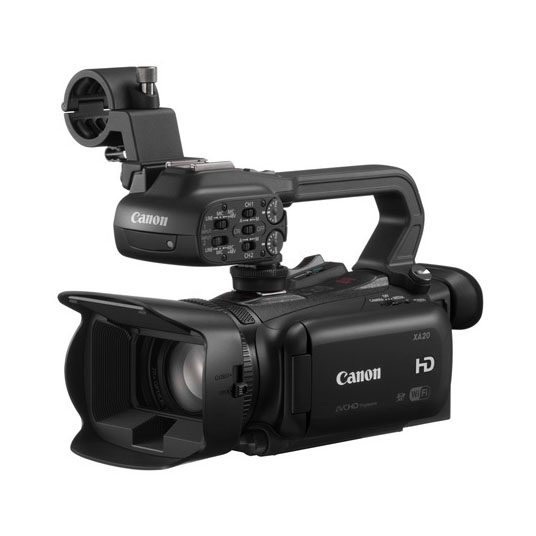 Included: Canon XA20 camcorder, lens hood, Canon AC adapter, batteries ×2, 32GB SD memory cards ×2, top handle with XLR inputs, HDMI cable, RCA cable (on request), bag.