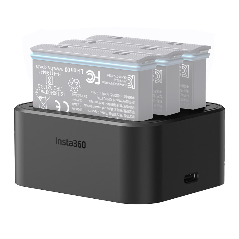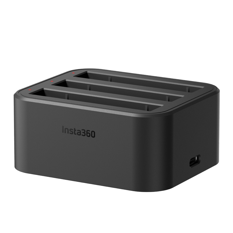 Charger for Insta360 X3 batteries can charge three batteries simultaneously. LED indicators show battery status. It is useful for long shoots when one, two, or three spare batteries can be charging while the main battery powers the camera. The USB Type-C port is used as the power input.