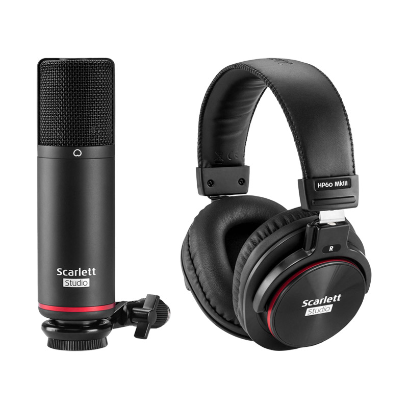 Included in the set: audio interface, headphones, microphone with holder, XLR cable, USB Type-A to Type-C cable.