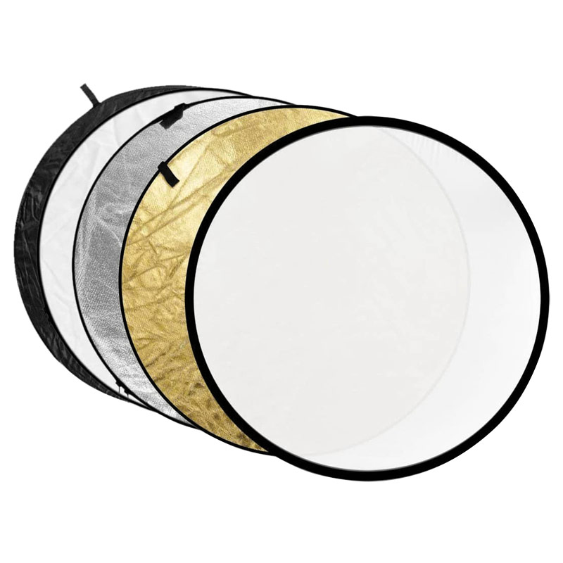 5-in-1 reflector disc with 60 cm diameter includes a translucent diffuser and a four-sided cover with white, gold, black, and silver reflective surfaces for shadow control in portrait and product photography. Folds into a compact 25x25x4 cm case.