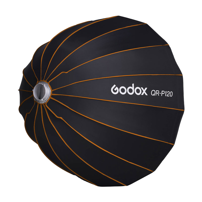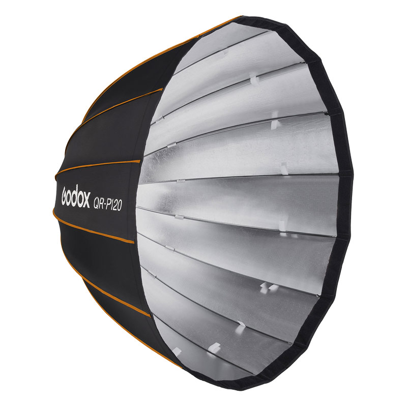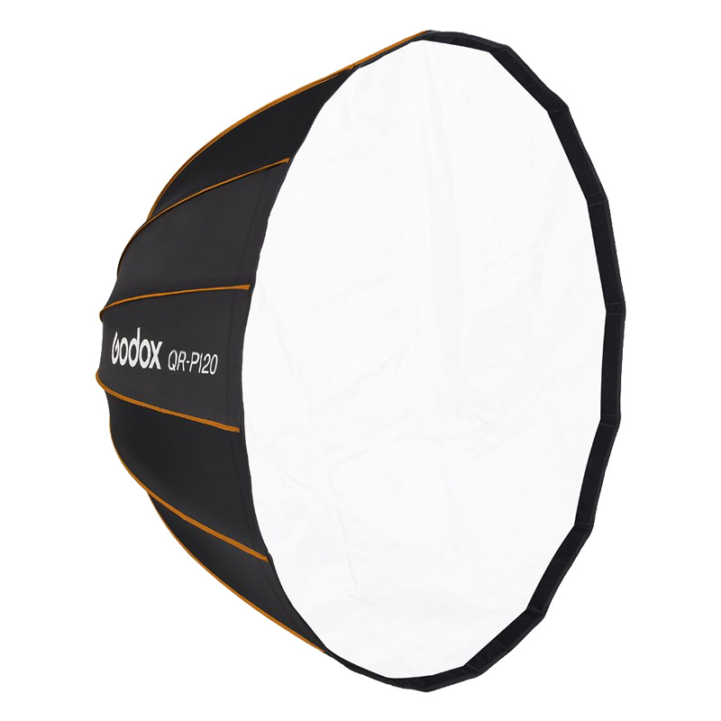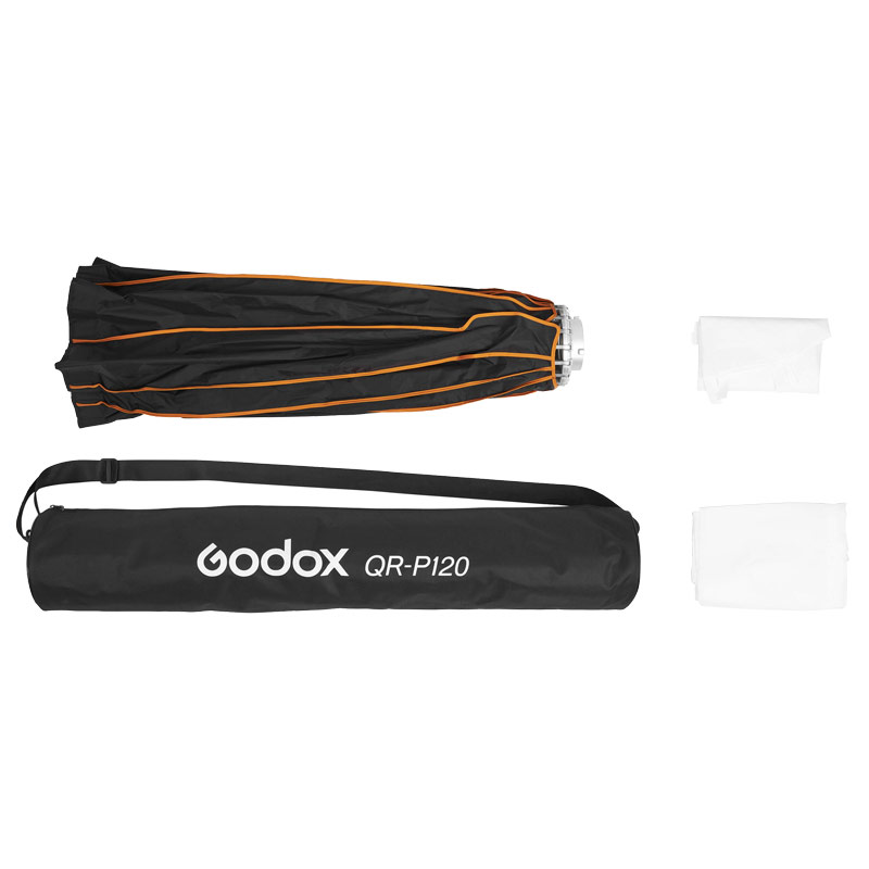 Godox QR-P120 parabolic quick-release softbox with a 120 cm diameter mounts to flash heads using a Bowens mount. Inner and outer diffusers provide soft light, while the silver interior enhances contrast and edge definition. The umbrella-style mechanism allows fast setup. Included: Godox QR-P120 softbox with Bowens mount, inner and outer diffusers, transport bag.