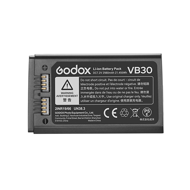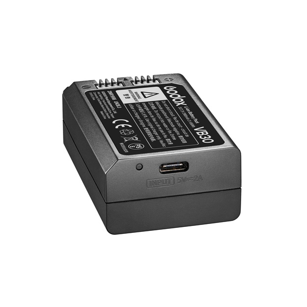 Godox VB30 is a rechargeable lithium-ion power source for the Godox V1Pro series flash. Rated at 7.2 V and 2980 mAh, with a capacity of 21 Wh.