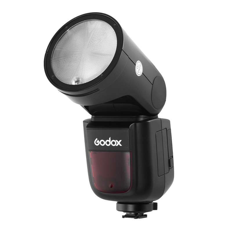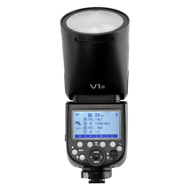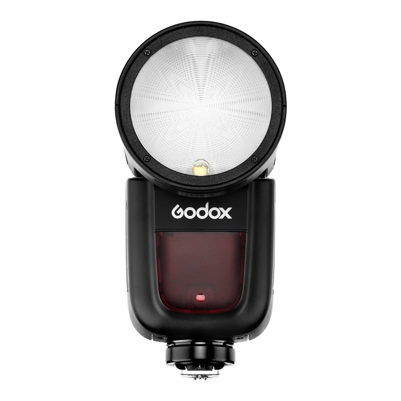 Godox Ving V1S TTL flash for Sony cameras has a 76 Ws flash output and a round-head design that produces an even, circular beam pattern. In addition to standard use, it can control other flash units or work as a slave; in slave mode it is compatible with 2.4 GHz devices, including the Godox Xpro radio trigger. The flash includes a 2 W LED modeling lamp. Magnetic mounting allows attaching optional light-shaping accessories. Powered by its own battery.