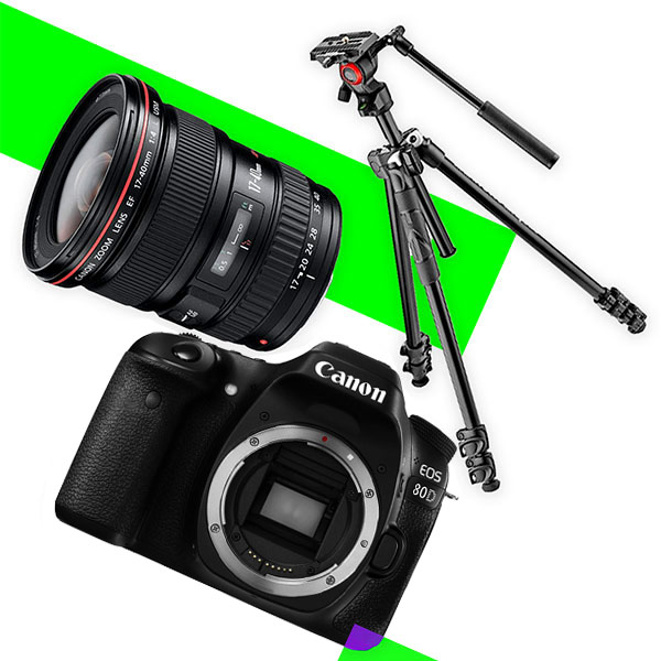 Canon 80D DSLR camera with an APS-C CMOS sensor (24.2 MP), DIGIC 6 processor, and continuous shooting at up to 7 fps. Supports Full HD video recording (1920 × 1080) at up to 60p.