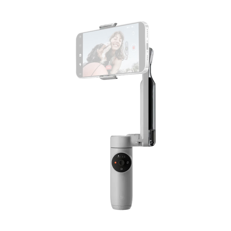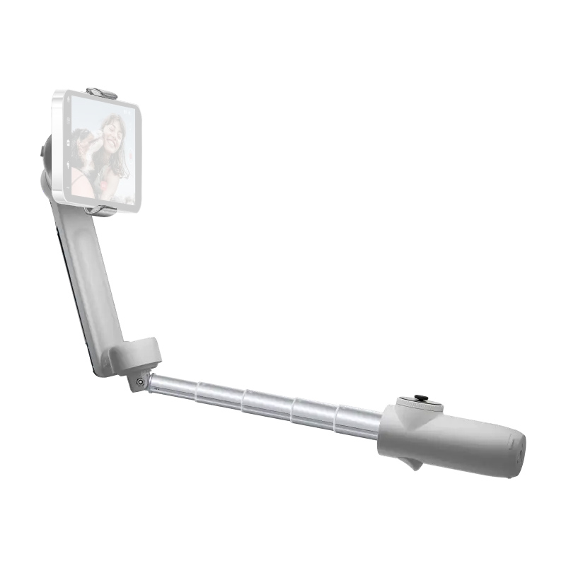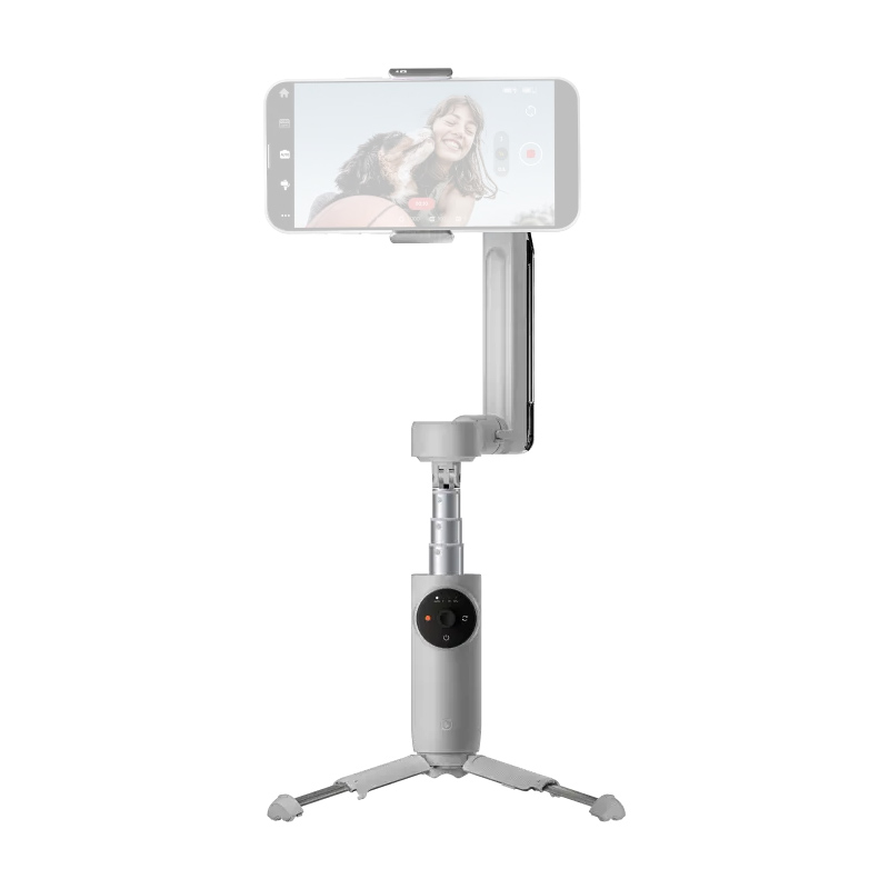The SmartWheel control dial and the front control button provide quick access to key functions. For example, switching the phone orientation from horizontal to vertical is done by double-tapping the right side of the control wheel marked with two arrows. Thanks to the extendable sections and the built-in tripod in the handle, the stabilizer can be used as a selfie stick or a tripod. The maximum extension length is 215 mm. A dedicated adjustable magnetic mount is used to attach the phone. Compatible smartphone dimensions: width 64–84 mm, thickness 6.9–10 mm. Supported payload: 130–300 g.