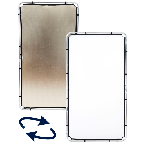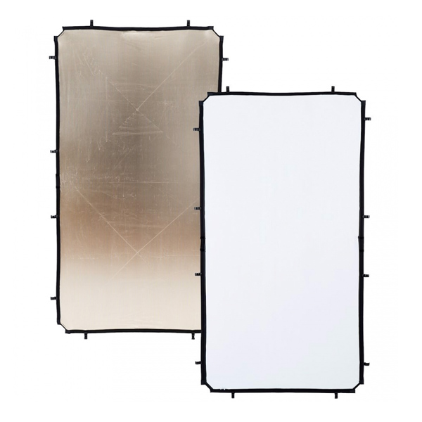Lastolite 110×200 cm sunfire/white double-sided fabric mounts to a Skylite Rapid Medium frame. White side provides soft neutral fill, sunfire gold side produces warm soft reflected light. Fabric attaches via clips. Frame not included.