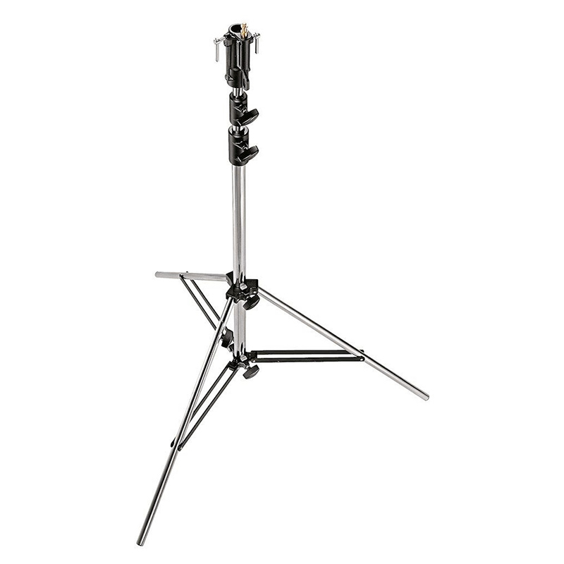 Chrome-plated stand for lighting fixtures weighing up to 20 kg. Well suited for video lighting, particularly ARRI fixtures from 650 W to 2 kW. Maximum height is 315 cm, minimum height is 124 cm. One leg includes adjustable leveling for uneven surfaces. Please note: the stand does not include a top spigot. A grip head is required for mounting fixtures, except for ARRI 650 P.O. and ARRI 2 kW units.