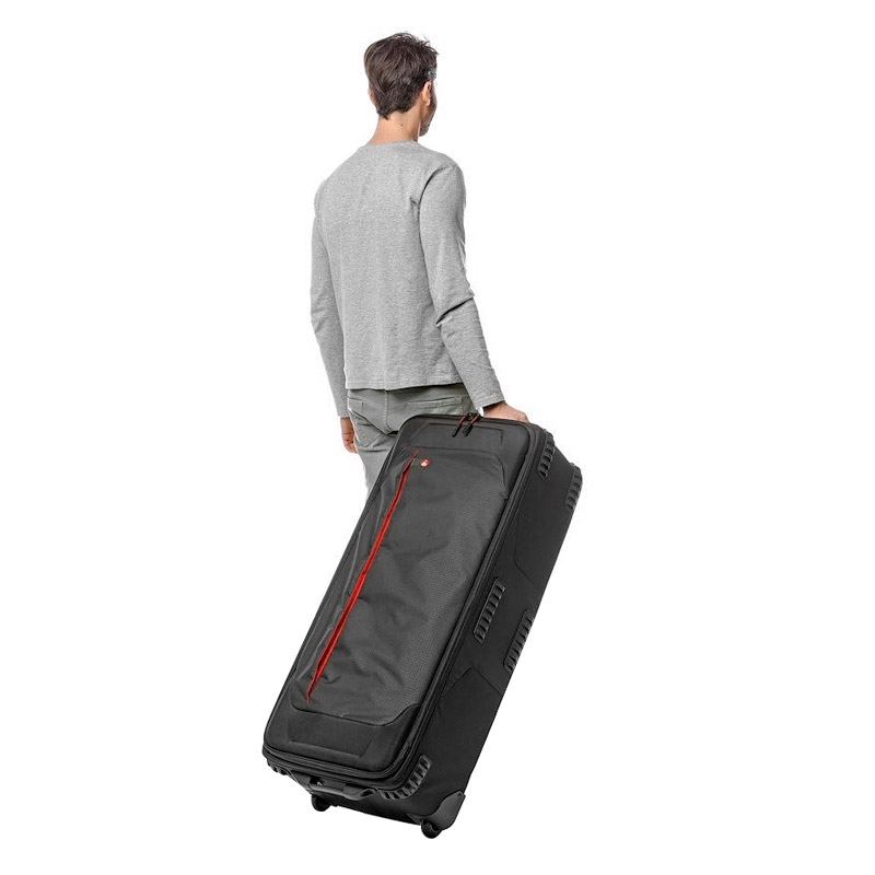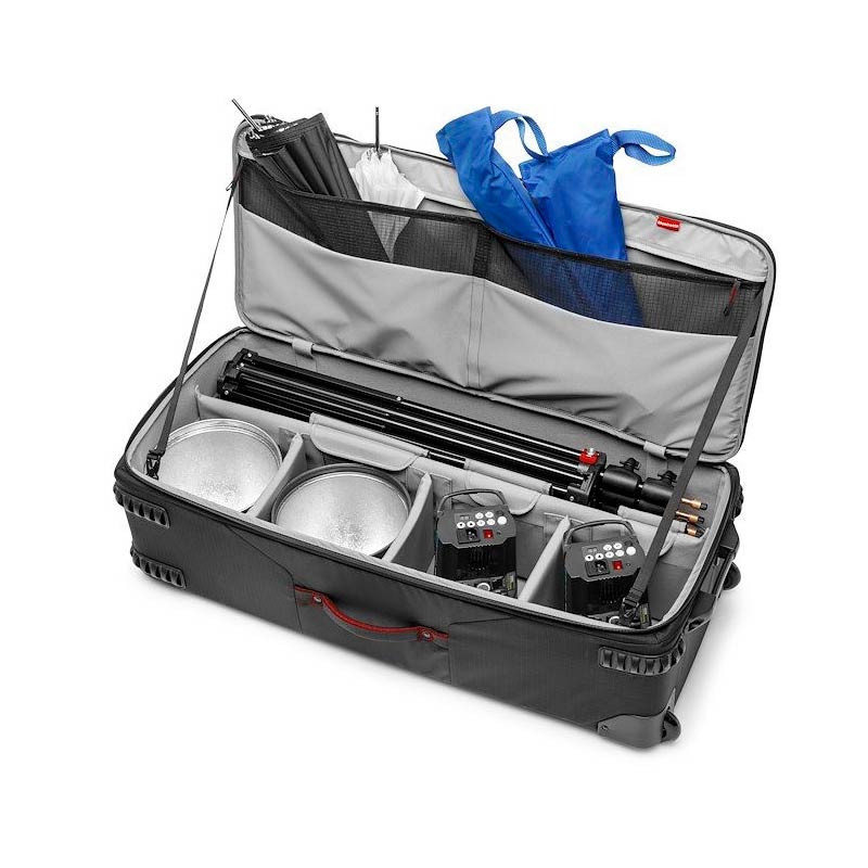 Manfrotto Pro Light LW-97W is a wheeled organizer bag for lighting equipment, stands, and accessories. Thanks to the Camera Protection System, which absorbs shocks and vibrations, the bag keeps equipment fully protected. It is suitable for photographers and videographers traveling with valuable equipment and accessories. The flexible internal layout with movable dividers makes the case compatible with kits from different manufacturers, including lamps, controllers, stands, batteries, and other accessories.