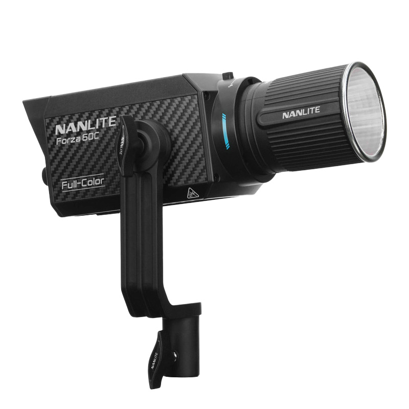 Nanlite Forza 60C LED light with adjustable color temperature from 1800K to 20000K and full RGB mode delivers 12,810 lux at 1 m at 5600K with reflector. The fixture uses a proprietary Nanlite mount. High color accuracy with CRI/TLCI 96/95 allows professional use, including live broadcasts. Fifteen built-in effects simulate off-camera lighting scenarios. Control is available via onboard controls or the NANLINK app. AC power operation is supported.