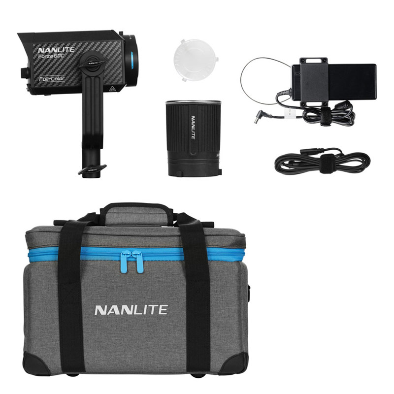 Included: Nanlite Forza 60C 1800K–20000K RGB, RF-FMM-45-S reflector, power supply, V-mount power supply bracket, power cable, protective cap, eye bolt, transport bag.