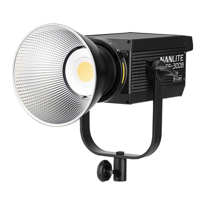 Nanlite FS-300B LED light with adjustable color temperature from 2700K to 6500K delivers 11,130 lux at 1 m at 5600K. High color accuracy with CRI ≥96 and TLCI ≥97 makes it suitable for video production, cinematography, and live broadcasts. A Bowens mount supports light-shaping accessories. The cooling fan ensures stable operation and can be switched off when required.