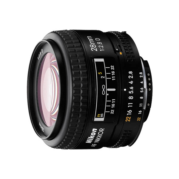 Nikkor AF 28mm f/2.8 D is a Nikon F compact wide prime with f/2.8 aperture, screw-drive AF (no built-in motor), 74° FOV, and 0.25 m minimum focus distance.
