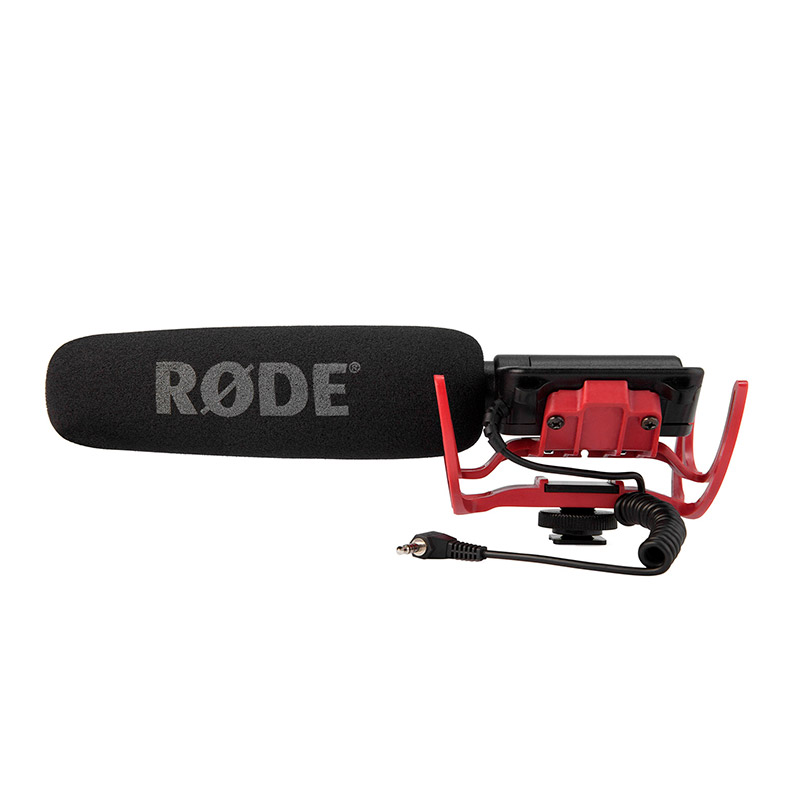 RØDE VideoMic is a compact shotgun microphone designed for digital video cameras and DSLRs, offering low self-noise and a wide frequency range for its size. It handles SPL up to 134 dB, is powered by a 9 V battery, includes a switchable low-cut filter, and features a battery status LED. The three-position rear switch controls filter on, filter off, and power off. It mounts via standard shoe mount and connects via stereo 3.5 mm minijack. Included: Rode VideoMic with integrated minijack cable, windscreen, hot-shoe mount, box.