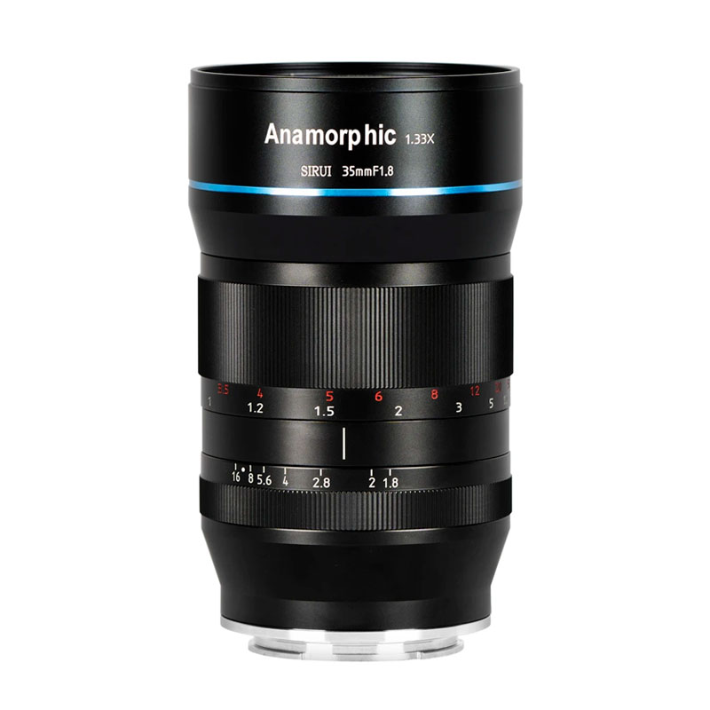 Sirui 35mm f/1.8 Anamorphic (MFT mount) — an anamorphic lens that creates a cinematic 2.4:1 image when shooting on cameras with an MFT crop sensor. Unlike traditional lenses, the Sirui 35mm f/1.8 Anamorphic increases the horizontal field of view by 33%, making the frame wider; full-frame equivalent focal length is 26.3 mm. The lens elements feature a special nano coating that delivers a sharp image and produces classic cinematic blue horizontal flares and oval bokeh.