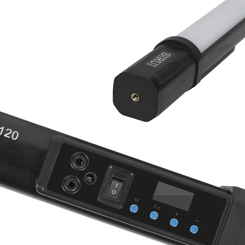 Sirui T120 Pro LED tube features a telescopic design and can operate in two positions with an active length of 60 cm or 120 cm. The light can be used in various applications for professional-level video and photo production. Color temperature is adjustable from 2500K to 8000K, and RGB mode allows setting almost any color shade. The fixture includes key features for different shooting needs: CRI/TLCI 97, 14 lighting effects, and the ability to integrate into a professional DMX lighting system.