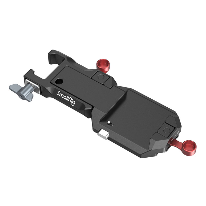 SmallRig 3249 mounting plate features adjustable length and a locking mechanism, allowing the use of larger cameras and cages on a stabilizer. The design includes multiple 1/4″ threaded holes for mounting additional accessories. Please note that compatibility with a specific cage and camera should be checked in advance before rental at the counter.