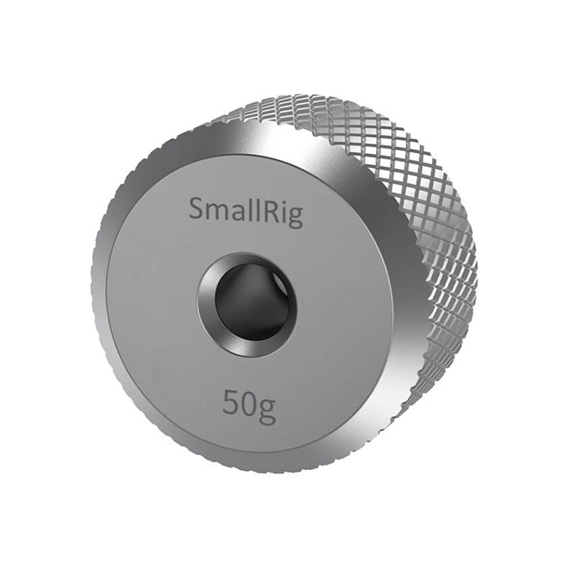 SmallRig 50 g counterweight is used to balance a stabilizer when shooting with long lenses or heavy cameras. One side of the counterweight has a 1/4″ screw for mounting to a SmallRig counterweight plate, while the opposite side features a 1/4″ threaded hole for stacking multiple counterweights.