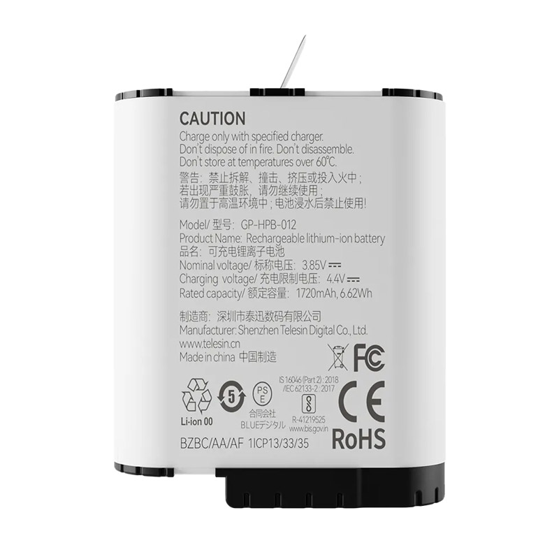 Telesin High Performance Stamina battery for GoPro Hero 9, 10, 11, and 12 action cameras is designed for low-temperature operation. The battery capacity is 1720 mAh and it lasts longer in sub-zero conditions than the standard battery. The battery supports operation down to -15°C.