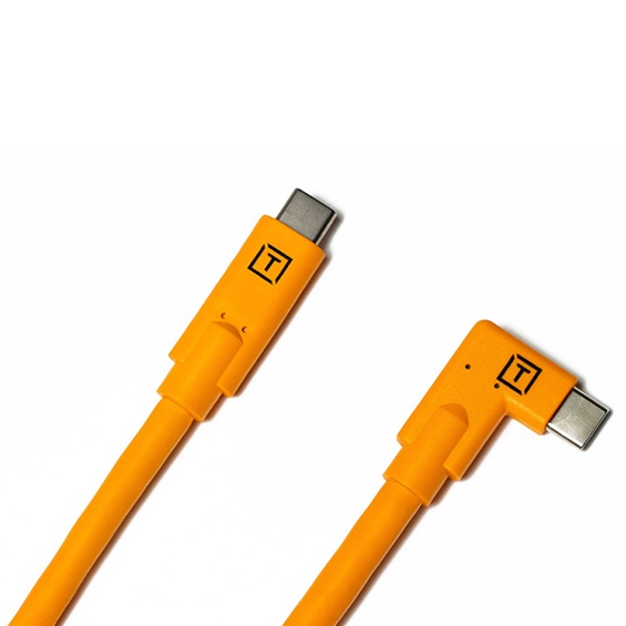 TetherPro 4.6 m USB-C to USB-C cable with a right-angle connector — a popular choice for photographers connecting a USB-C camera to the USB-C port on a computer. The single right-angle connector provides a secure connection at the camera port for stable contact and reliable data transfer. The angled plug sits flush along the side of the camera port, staying out of the way and allowing comfortable handheld operation. USB-C is a current standard that provides fast and reliable data transfer for modern cameras and laptops.