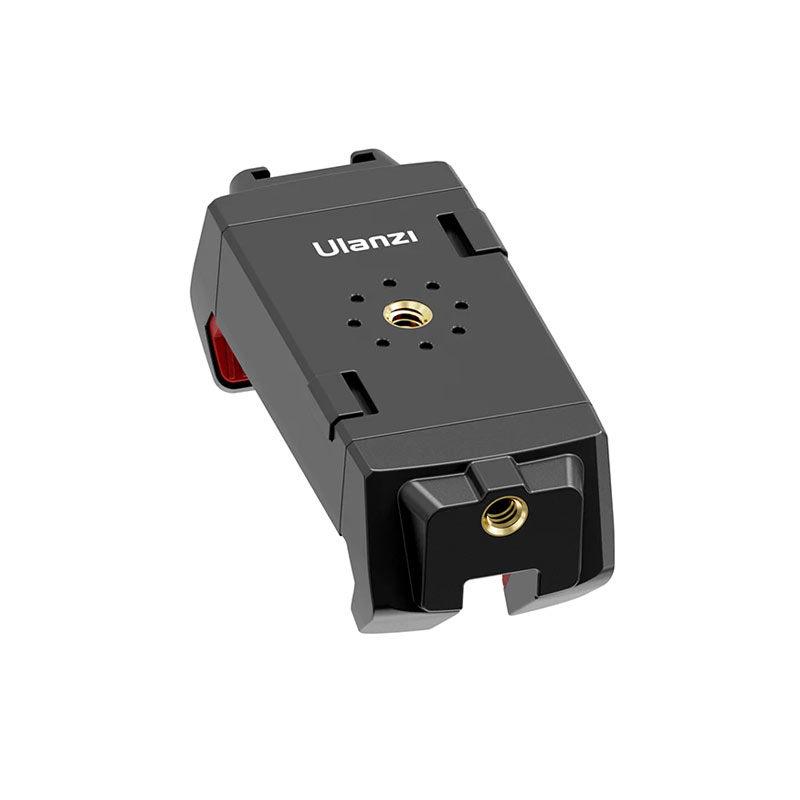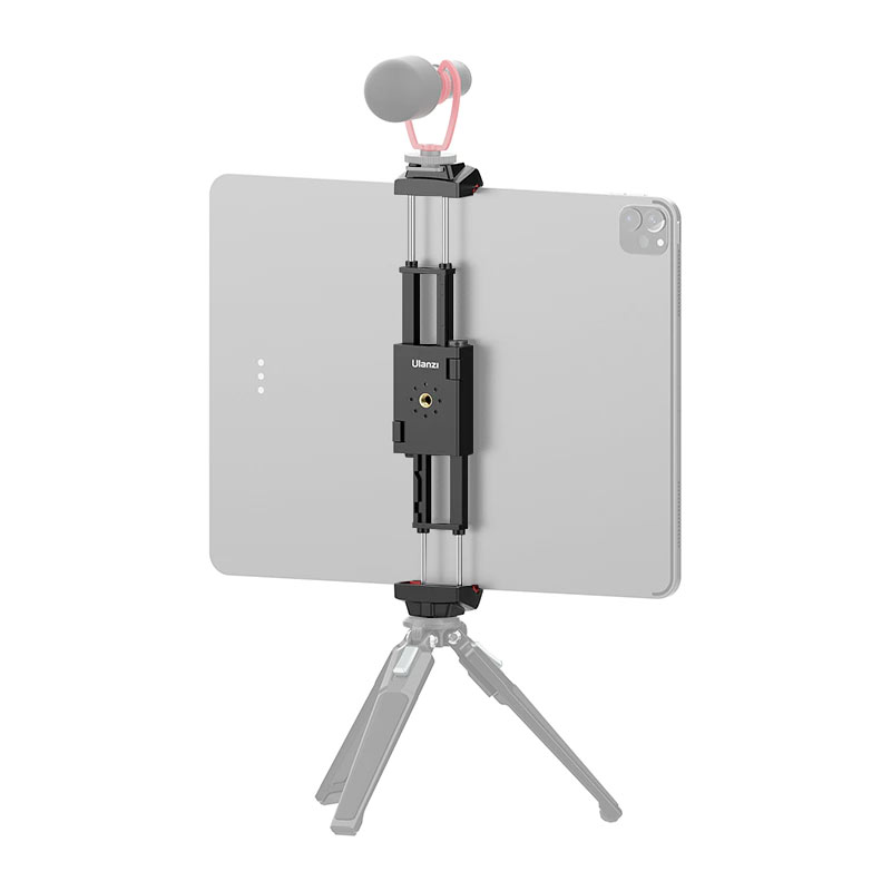 Ulanzi ST-29 universal holder has an adjustable sliding design and supports mobile devices with width or height from 6.7 to 22.5 cm. The bottom clamp includes a dedicated cutout for a charging cable, and the top includes a hot shoe mount. Two 1/4″ threads on the body are provided for mounting to a tripod, selfie stick, or monopod. Buttons on the back release the sliding mechanism.