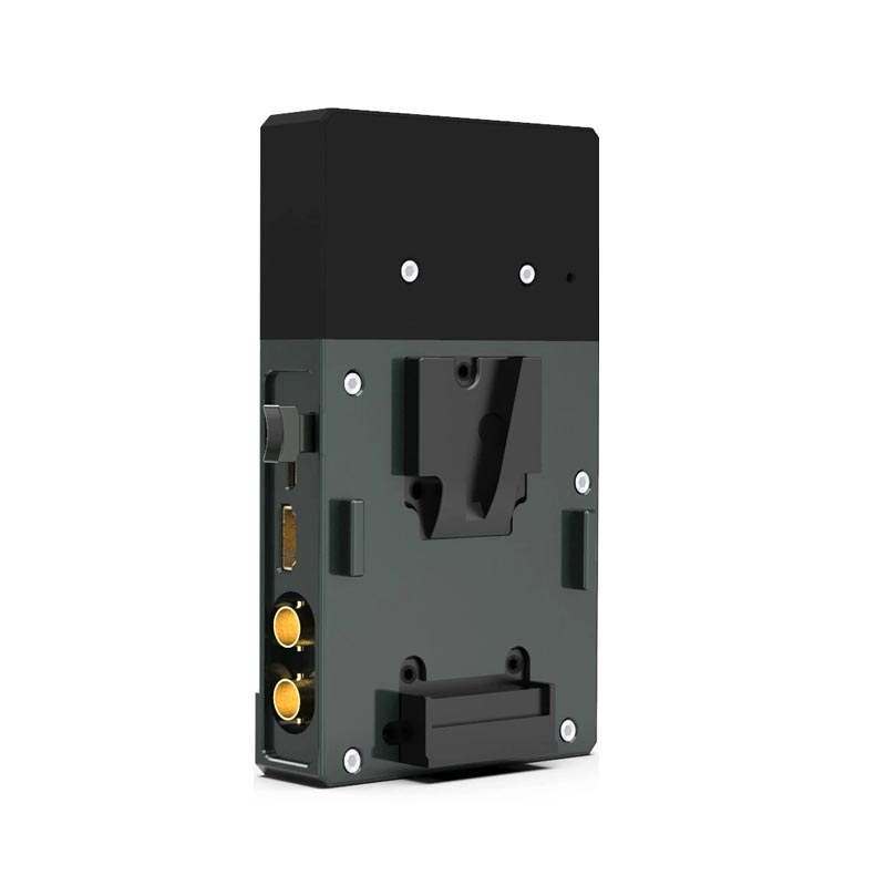 A V-Mount battery plate is mounted on the rear. The rental kit includes power via a 2-pin Lemo to D-Tap cable; batteries are rented separately. Weight: 435 g.