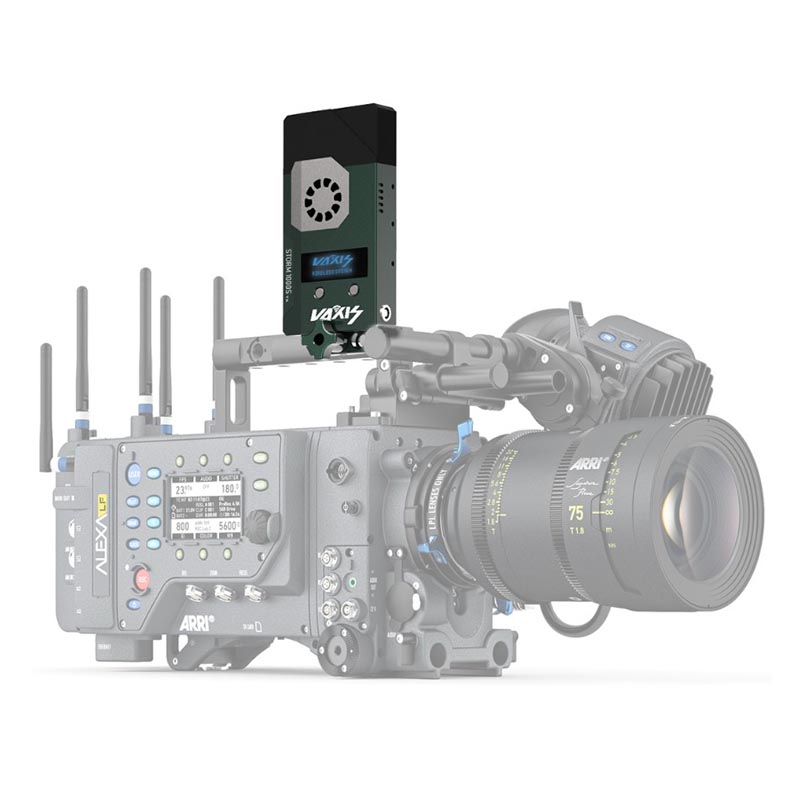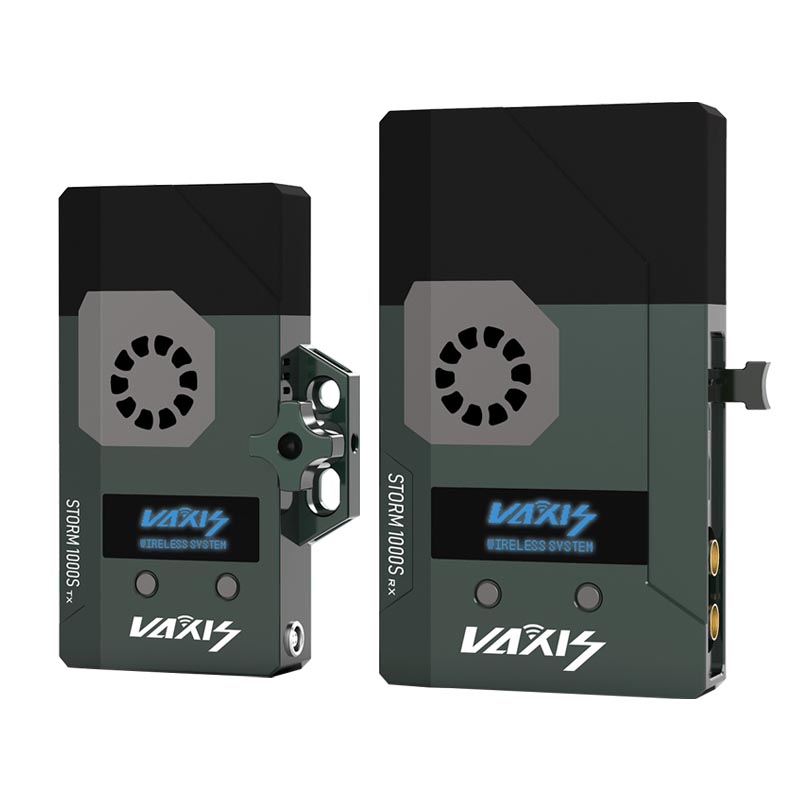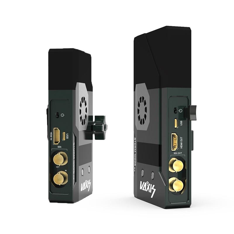 Vaxis Storm 1000s kit is designed for wireless video transmission at distances up to 350 meters with zero latency and video quality up to 1080p/60. The system features a compact design without external antennas. One transmitter can simultaneously transmit to two receivers. The transmitter body includes SDI input and output, HDMI input, 2-pin Lemo power input, and micro-USB port. The receiver features two SDI outputs, one HDMI output, 2-pin Lemo power input, and micro-USB port. Both units include active cooling; fan speed and core settings are controlled via an OLED display. The transmitter has 1/4″ and 3/8″ mounting threads. The receiver is equipped with a V-Mount battery plate. Power is supplied via 2-pin Lemo to D-Tap cables; batteries are rented separately. Transmitter weight is 290 g, receiver weight is 435 g. Included: transmitter, receiver, 2× 2-pin Lemo to D-Tap cables, 1/4″ and 3/8″ screws, transport case.