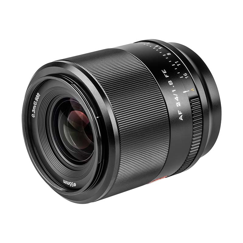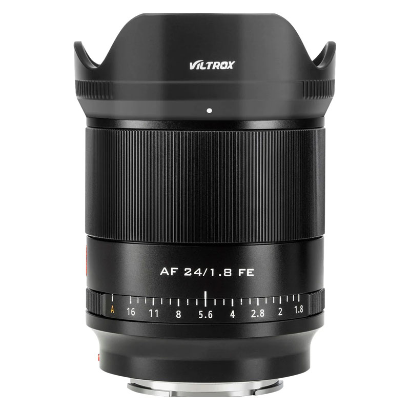 Viltrox AF 24mm f/1.8 STM FE for full-frame Sony E-mount cameras is suitable for interior, architecture, landscape, and general photo/video shooting. The bright f/1.8 aperture supports low-light work and provides bokeh with background blur. The STM autofocus motor operates quietly and smoothly. Included: Viltrox AF 24mm f/1.8 STM FE for Sony E lens, UV filter, front and rear caps, lens hood, transport pouch.