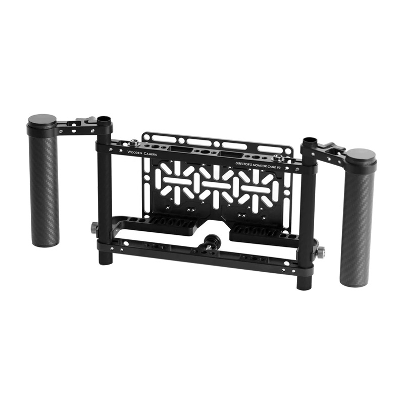 Wooden Camera Director’s Monitor Cage v3 supports monitors up to 9″, includes side handles, top/bottom plates, 160 mm rods, rotating monitor plate, and IDX V-mount plate with dual D-Tap outputs.