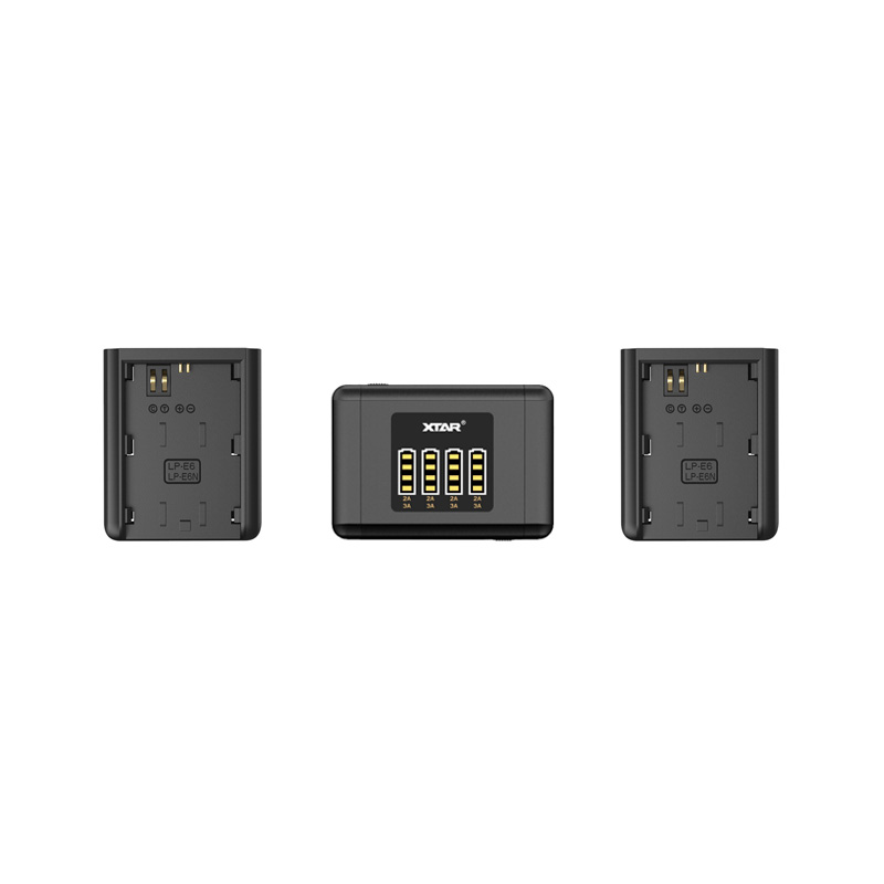 XTAR SN4 4-bay charger for Canon LP-E6 / LP-E6N batteries is a modular system with a base and two double-sided charging modules, each designed to hold a pair of batteries. One or two modules can be used at the same time. An additional advantage is portability and the ability to power the system via the USB Type-C port from various sources.