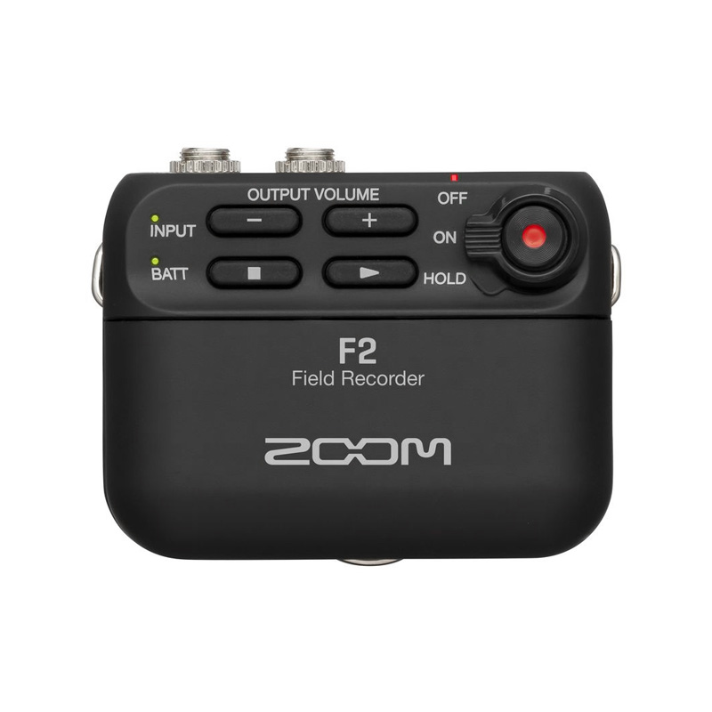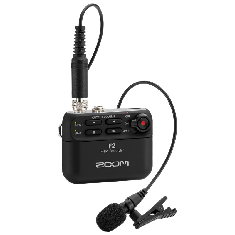 Included in the set: Zoom F2 recorder, lavalier microphone, windscreen, 64 GB microSD card, belt clip, carrying pouch.